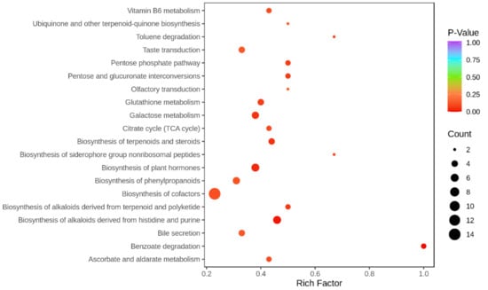One hundred and fifty-eight DAMs were enriched in 135 KEGG pathways, the most enriched pathways are Biosynthesis of cofactors, Biosynthesis of plant hormones, Biosynthesis of alkaloids derived from histidine and purine, and Galactose metabolism (Figure 10).