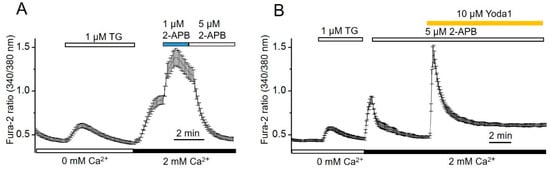 2.4. Contribution of SOCE in Piezo1-Induced Ca2+ Influx