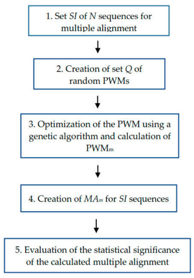 Diagram of the algorithm for multiple alignment of amino acid sequences shown in Section 4.1. Set of N sequences for multiple alignment is denoted as SI. Q is set of random PWMs (see Section 4.2). PWMm is matrix that has the maximum value of the similarity function when aligning sequences from the set SI (see Section 4.3 and Formula (4)). MAm is a multiple alignment built for sequences from SI set using PWMm (see Section 4.5 and Formula (5)).