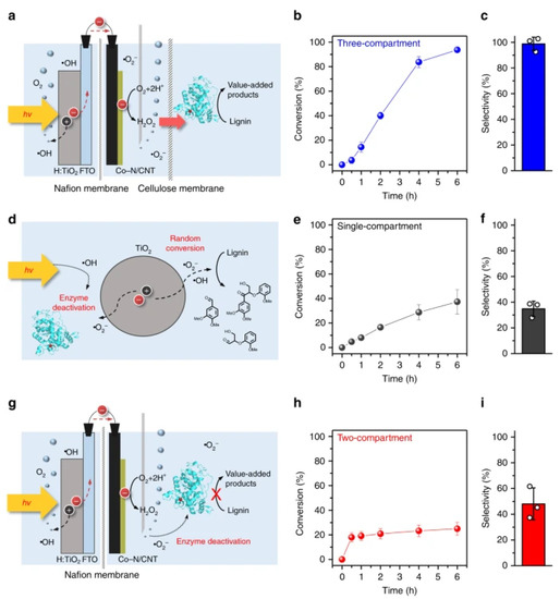 Lignin peroxidase has been used for selective cleavage of β-O-4 bonds in lignin but it requires an external source of H2O2 and its concentration mainly depends on enzyme stability [53]. The integration of electro(photo)chemical generation of H2O2 system with enzymatic catalysis is known to improve the process efficiency. Lignin peroxidase has also been used for depolymerization of β-O-4 lignin model compound and lignin in a three-compartment cell separated with Nafion and cellulose membranes together with TiO2 photocatalyst and Co-N/CNT as an electrocatalyst (Figure 1) [54]. This photoelectrobiochemical system enabled lignin dimer cleavage with high conversion efficiency (93.7%) and selectivity (98.7%) to 3,4-dimethylbenzaldehyde. Oxygen was reduced electrochemically at the Co-N/CNT cathode which generated the formation of hydrogen peroxide. The produced hydrogen peroxide entered the biocatalytic compartment and mediated the biocatalyst, lignin peroxidase, for depolymerization. Low selectivity and conversion efficiency was obtained in single and two-compartment cells. It was observed that a continuous low supply of hydrogen peroxide was compulsory for lignin peroxidase enzymatic activity.