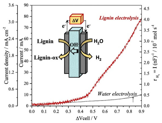 In another study, a polymer electrolyte membrane (PEM) reactor was used for the sustainable production of pure hydrogen gas at approximately 0.45 V in a continuous flow from lignin electrolysis [83]. The electrochemical cell was composed of Pt-Ru/Fumapem (-OH conductor)//Pt/C representing anode//anion exchange membrane/cathode assembly (Figure 3). It was observed in the study that increases in temperature (30–90 °C) enhance the reaction efficiency for hydrogen production. In the absence of alkaline lignin solution, water electrolysis and production of hydrogen were not observed even at 80 °C at the potential range of 0 V – +0.9 V. In the presence of lignin, the production of hydrogen was observed at a 0.21 times lower potential than required normally for water electrolysis. Hydrogen was observed in 0.4 μmols−1 as a maximum under the studied reaction conditions. Moreover, oxygen evolution was not observed because lignin oxidation took place at voltages lower than required for OER reaction. However, no oxidation products of lignin was observed at the anode.