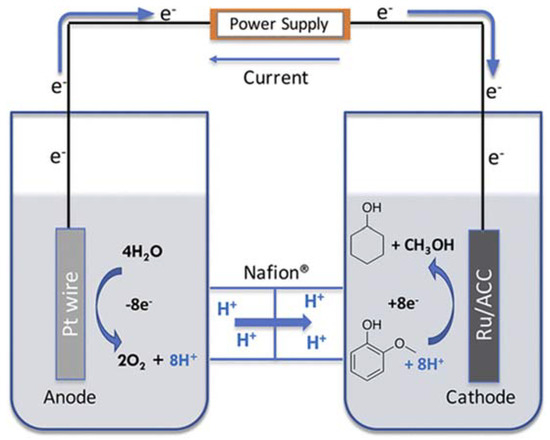 Upgrading of lignin-derived model compounds and bio-oil is extensively studied by catalytic hydroprocessing but it suffers from high capital and operating costs [93]. In contrast, electrocatalytic hydrogenation (ECH) offers mild conditions and avoids mass transfer and hydrogen gas solubility problems [94]. The low temperature used in ECH avoids catalyst poisoning which potentially reduced the process cost. Integrating pyrolysis with electrocatalysis for the production of fine chemicals and fuel could significantly increase the process efficiency and profitability of biorefineries. Fast pyrolysis of lignin to deconstruct the lignin structure and obtain bio-oil first, followed by subsequent electrocatalytic hydrogenation to obtain deoxygenated and saturated products, could be a promising strategy. Only a few examples are discussed for a short overview of the technology. A review is recommended for a detailed overview [95]. Ru/ACC was used as a cathode at mild temperature (80 °C) for ECH of twenty different model compounds including phenol, guaiacol, syringol, alkyl phenol, aryl-methyl ethers, and several others which are mainly present in the lignin bio-oil [96]. The ECH reaction was carried out in a divided cell separated by Nafion 117 membrane, 0.2 M HCl solution and 0.2 M phosphate buffer were used as catholyte and anolyte (Figure 4). Hydrogenation together with C–O and C–C bond cleavage was observed. An increase in alkyl chain length not only decreased the conversion efficiency while selectivity for demethoxylation was also reduced. Conversion of guaiacol was increased in the presence of vicinal hydroxyl or methoxyl groups. On the other hand, faradaic efficiency was increased with the increased initial concentration of substrate.
