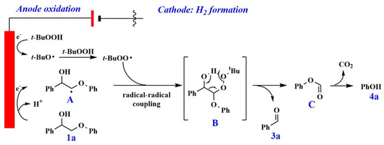 A process for selective cleavage of Cα–Cβ bond in β-O-4 linkage in lignin model compounds in the presence of tert-butyl hydroperoxide in water as an oxidant is reported to produce high yields of aldehydes and phenol [109]. The electrocatalytic reaction took place under mild reaction conditions at room temperature in an undivided cell with a Pt as an anode while simultaneous production of H2 at the Pt cathode is also observed. Aldehydes were obtained in 67% yield with a faradaic efficiency of up to 12% at an electric current of 20 mA for 3 h. A decrease in yield is observed at lower current while increasing current further to 50 mA showed a positive increase in the yield. It was observed that an increase in the methoxy substituents decreased the reaction efficiency due to over-oxidation or further polymerization of the intermediates. It was shown that reaction occurred through the formation of the Cβ radical initiated by the peroxide intermediate (Figure 5). The reaction strategy is shown to be applicable to real lignin.