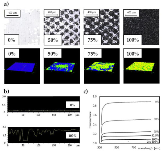 (a) Optical micrographs of toner surfaces printed on PET foils at different grayscale levels (0–100%) (top row); topographies of single toner islets at higher magnification imaged in 3D with a laser microscope (bottom row). (b) Cross-sectional profiles of PET (pristine) and PET@toner at 100% grayscale level. (c) Transmittance spectra of toner-covered foils printed at various grayscale levels (0%, 50%, 75%, 82.5%, 100%, 2 × 100%) registered in the range 300–900 nm.