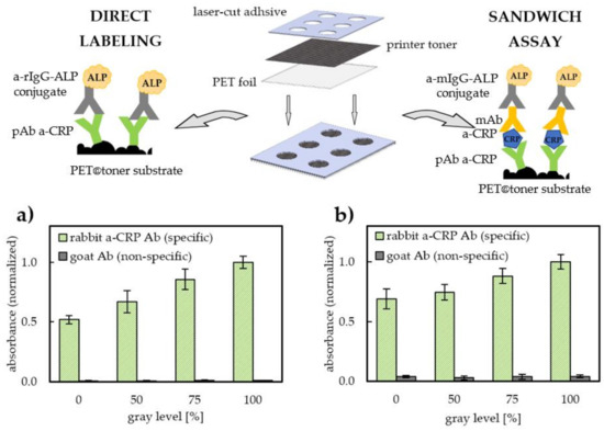To evaluate the applicability of laser toner-coated PET as a substrate for immobilization of antibodies, first the effect of the degree of toner coverage on both the antibody binding capacity and ability to bind model antigen (C-reactive protein, CRP) was checked. Utilization of hydrophobic interactions remains very popular and is widely used as a driving force of passive immobilization of immunoglobulins, which is exemplified by the routinely used antibody-coated microtiter plates, acting as supports in a construction of diagnostic immunoassays. Hence, it was decided to compare the ability of antibodies to be immobilized on an unmodified (originally hydrophobic) PET substrate and printed micropatterns obtained using the laser toner. For this purpose, foils printed at various grayscale levels (0–100%) were used. To ensure the uniformity of the tested geometric areas, a laser-cut masks made of a medical adhesive tape were attached to the previously printed PET@toner pieces. In such a way, two-layer, semi-open arrays of microwells with an architecture corresponding to a multi-well plate were obtained (See Figure 2). This format seems to be perfectly suited to immunoreactions carried out in high-throughput in droplet-arrays. The application of enzymatically labeled antibodies (goat-anti-rabbit IgG conjugated with alkaline phosphatase, a-rIgG-ALP), followed by detection of a water-soluble chromogenic reaction product, allowed for a comparison of the relative surface loadings of rabbit polyclonal anti-CRP antibodies (pAb a-CRP) used as a model immunoreceptor. On the other hand, an indirect sandwich assay was constructed to evaluate the total antigen-binding capacity of adsorbed pAb a-CRP. Details of the construction of immunoassays used in this study are schematically presented in Figure 2.