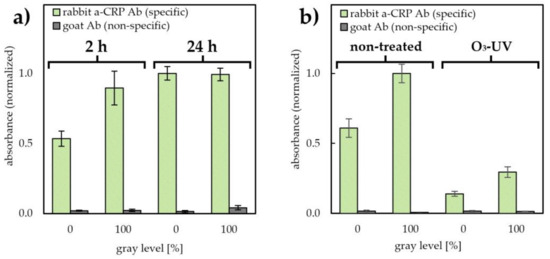 Comparison of the kinetics of antibody adsorption on PET and PET@toner (100% grayscale level) after 2 h and 24 h antibody coating (5 µg/mL pAb a-CRP Abs solution in carbonate buffer pH 9.6, n = 5) (a). Studies on the effect of dry hydrophilization (5 min ozone/UV treatment) on pAb a-CRP antibody binding capacity of PET and PET@toner substrates (n = 5) (b). pAb a-CRP surface densities were determined by direct immunolabeling by means of 30 min incubation in 500 ng/mL a-rIgG-ALP conjugate in PBST buffer with 1% bovine serum albumin (BSA). Values are expressed as relative absorbances of the reaction product derived from 15 min immunolabeling. Ab—antibody, a-CRP Ab—antibody against C-reactive protein.