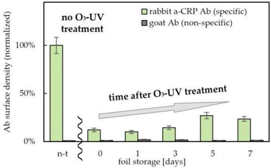 The key parameter from the point of view of the proposed technology is the long-term stability of the obtained layers. Maintenance of high wettability and low binding capacity of hydrophilized zones under storage conditions is particularly important in the context of the implementation of PET@toner substrates in microfluidic devices. Such zones can find applications in the construction of layers responsible for transportation of reagents, e.g., in form of microchannels. Therefore, in the current experiment, long-term stability of anti-fouling properties of toner-covered PET foils after ozone/UV irradiation was tested, and the results were normalized to the non-hydrophilized PET@toner substrate. As shown in Figure 4, the amount of adsorbed pAb a-CRP to the hydrophilized PET@toner foils remained relatively low for at least 7 days after irradiation. The highest anti-fouling capacity is shown by the foil irradiated immediately before the Ab coating (12.0% of the initial value). Oxidized PET@toner foil stored in a dry environment for 5–7 days after hydrophilization partially lost its anti-fouling properties (Ab surface density corresponding to 23–27% of the value for the unmodified PET@toner substrate was measured). It is however worth underlining that even then there was still about a 4 times lower amount of adsorbed antibodies than for the substrate before the hydrophilization. These results prove the permanent oxidation of the toner surface with the formation of stable, hydrophilic groups counteracting the adsorption of protein components. This distinguishes the toner from another popular material used in microfluidic technologies, i.e., PDMS, for which the hydrophilic properties of the surface decay spontaneously in a short time [48].