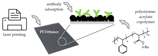 Schematic illustration of the fabrication process of PET@toner-based substrates for antibodies immobilization and immunosensing. PET—poly(ethylene terephtalate), n-Bu—n-butyl.