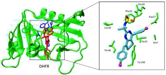 Figure 1 shows the best-scored docked pose of 3c bound to M. Tuberculosis DHFR (PDB code 1DF7). The ligand occupies a long groove, largely aligned by hydrophobic residues, adjacent to the DHFR binding site, such as Phe31. Ligand 3c was found to be well-suited within the DHFR active site, centered around residues Ile5, Gln28, Phe31, Ile94, and Tyr100, respectively [,,]. In addition to several hydrophobic interactions, 3c utilized its sulfonamide head group to interact with the protein through some hydrogen bonds by Gln28 (Figure 1, Insert Panel). Moreover, we identified that interactions involving active site residue Phe31 played a crucial role, driving π-π between the aromatic ring of 3c and the neighboring Phe31 residue.