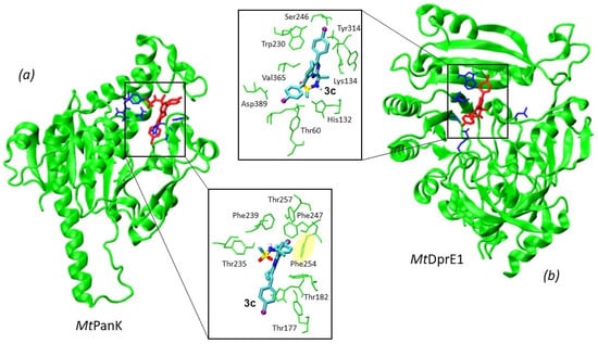 Figure 3a,b shows the best-scored docked pose of 3c bound to MtPanK and MtDprE1, respectively. In the case of MtPanK, ligand 3c penetrated deeply into a hydrophobic pocket of the enzyme, so that it became surrounded by aromatic side-chains of Thr177, Thr182, Phe239, Thr235, Phe247, Phe254, and Thr257, respectively (Figure 3a). The binding pose of 3c fits well within the active site of MtPanK centered on Tyr177, His179, Tyr282, Tyr235, Arg238, and Asn277 [,], as shown in Figure 3a. The residue Phe254 plays a crucial role in the formation of the π-π stacking interaction between ligand 3c and the MtPanK protein, as seen in the insert of Figure 3a.