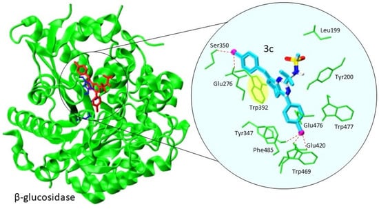 Figure 4 shows the best docking pose of ligand 3c at the β-glucosidase enzyme. It can be noted that 3c inserted deeply into the active site cleft, so that its 4-aril moiety reached the middle of the protein fold. It has been recognized that the long active site cleft of β-glucosidase provides many water-mediated hydrogen bonds and aromatic-stacking interactions. This is why this protein pocket is believed to be a critical scaffold for efficient hydrolysis of oligosaccharides by the diverse family of β-glucosidases, so that it is commonly considered as an active target in molecular docking studies [,,]. It should be pointed out that the binding of ligand 3c was driven by hydrophobic interactions with Trp392, Trp469, Trp477, and Phe485, among which Trp392 plays a crucial role. Moreover, ligand 3c bound well-within the active site residues Glu186, Trp392, and Glu420 of β-glucosidases, as demonstrated in Figure 4. In addition, Trp392 formed a π-π staking interaction with the quinazoline ring of 3c, as seen in the insert of Figure 4. Finally, the peripheral polar chlorine substituents of ligand 3c participated in H-bonding with Glu276, Ser350, Glu420, and Phe485, respectively.