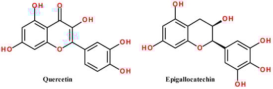 Some natural inhibitors for β-glucosidase—quercetin and epigallocatechin (EGC). Heteroatoms and key functional groups are color-coded.
