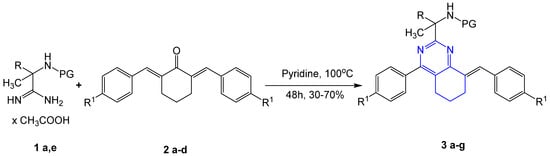 Recently, this synthetic procedure was applied to a reaction of different bis-benzylidene cyclohexanones with guanidine hydrochloride in the presence of NaH in DMF as a solvent, resulting in the formation of 8-(arylidene)-4-(aryl)5,6,7,8-tetrahydroquinazolin-2-ylamines with a yield of 19–28% []. Herein, we report the use of α-aminoamidines for the synthesis of a new series of 5,6,7,8-tetrahydroquinazoline derivatives by their reaction with bis-benzylidene cyclohexanones. The method is characterized by excellent yields, mild reaction conditions, and easy workup, so that it is an advance over the existing synthetic procedures. The key advantage of new tetrahydroquinazoline derivatives is the presence of protecting groups (PG) at the C2-tert-butyl moiety of the quinazoline fragment. We demonstrate that these PGs can be readily cleaved, resulting in the appearance of the terminal free amino group, which opens up further opportunities for their functionalization.
