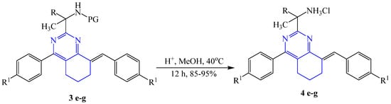 Using compounds 3e-g and the modified synthetic procedure from [], we obtained unprotected 5,6,7,8-tetrahydroquinazolines 4e-g, which can be used for synthetic purposes as building blocks. Cleavage of Boc-derivatives of tert-butyl-(2-(8-arylidene-4-aryl-5,6,7,8-tetrahydroquinazolin-2-yl)butan-2-yl)carbamates 3e-g was realized with a good yield by stirred-in MeOH with added concentrated HCl at 40 °C for 24 h (Scheme 2).