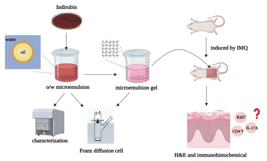 The schematic illustration of the study on indirubin microemulsion gel. Firstly, indirubin microemulsion was prepared and characterized, then carbomer 934 was used as a gel matrix to increase the viscosity of the microemulsion, and the anti-psoriatic activity of the preparation was evaluated by H&E and immunohistochemical assays.