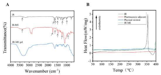 Drug and adjuvants compatibility. (A) FTIR spectra of IR, IR-ME, and IR-ME gel (arrows indicate the characteristic infrared absorption peak of IR). (B) DSC thermograms of IR, Pharmacevtic adjuvant, physical mixture and IR-ME.