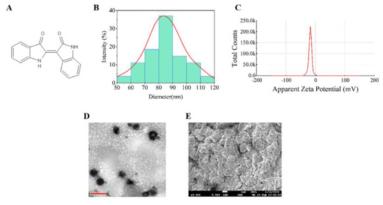 The concentration of IR was determined by the high performance liquid chromatography (HPLC) method, and the chromatographic condition was shown as below. Column: Diamonsil C18 column (250 mm × 4.6 mm, 5 μm); Mobile phase: methanol/water (70:30); Flow rate: 1.0 mL/min; Detection wavelength: 292 nm; Column temperature: 40 °C; Injection volume: 20 μL. Taking the mass concentration of IR as the abscissa (C) and the peak area as the ordinate (A) to draw the standard curve, the linear regression equations are: A = 34,156C − 6356.4 (R2 = 0.9993). The results showed that indirubin had a good linear relationship in the concentration range of 0.5–20 µg/mL.