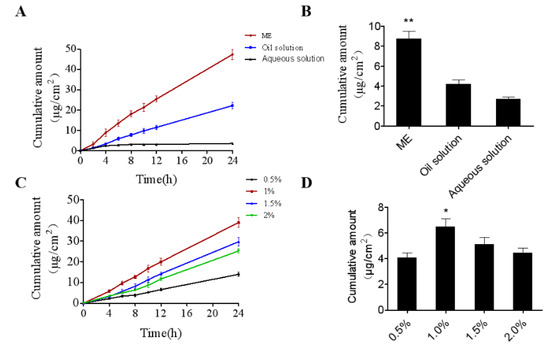 In the present study, the transdermal diffusion of ME, ME gel, and olive oil solution in vitro was investigated by Franz diffusion cells. The mouse skin was fixed between the two halves of the diffusion cell, with the epidermis facing the donor compartment and the dermis facing the receptor compartment and in close contact with the receiving fluid. The volume of the receiving tank was 10 mL, and the effective area of the diffusion tank was 0.8 cm2. The receiving solution was a saline solution containing 30% ethanol, and the receiving solution was degassed by ultrasonic waves at the same time. The temperature of the constant temperature water bath was 35 °C, and the rotation speed was 500 rpm. After 24 h, the skin was removed, and the effective skin through which the drug penetrated was carefully cut off and rinsed with normal saline. The skin samples were minced, 1 mL of DMF was added for sonication for 1 h, the above steps were repeated once. The two supernatants were combined, filtered through a 0.22 μm microporous membrane, and injected into a high-performance liquid chromatography analyzer. The amount of IR retained in the formulation was calculated after 24 h. At the same time, samples were taken from the receiving medium to study the transdermal accumulation of the drug.