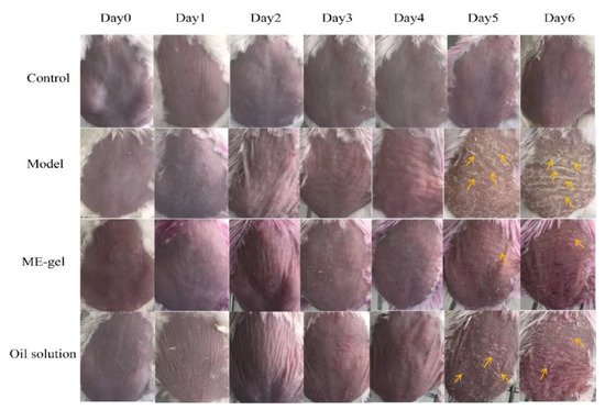 The back psoriasis-like symptoms of experimental mice in each group were evaluated after 6 days of topical application of ME gel and oil solution (arrows indicate the silvery scales of psoriasis skin and after treatment).