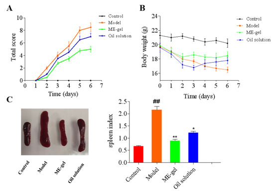 The spleen is the largest immune organ in humans and animals, and it is also the center of cellular and humoral immunity, containing a large number of immune cells. When the body suffers from an inflammatory disease, the spleen undergoes changes to a certain extent, and the spleen index is an important sign of an immune disease. Therefore, the therapeutic effect of drugs on inflammatory diseases can be judged by changes in the color and the spleen index. The body weight of the mice in the model group continued to decrease until it eased slightly on the 6th day (the symptoms began to subside on the 6th day after modeling). After drug treatment, the weight loss trend of mice was reduced on the third day (Figure 7B). After the mice were modeled, the immune system was stimulated by a large amount of IMQ ointment, resulting in an enlarged and blackened spleen and increased spleen index. As shown in Figure 7C, the spleen index of mice in the model group was significantly larger than that of control mice. After the drug treatment, the spleen index of the mice decreased, and especially the ME gel treatment group had a significant difference compared with the model group.