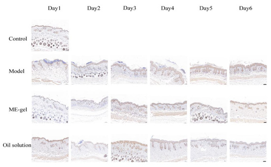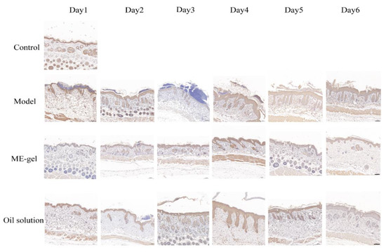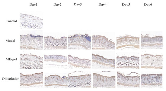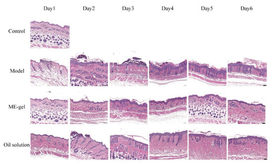 The anti-psoriatic effect of ME gel formulation was observed by H&E staining. The histological changes of different groups of skin specimens are shown in Figure 8. The epidermal layer of mice in the model group was significantly thickened, and there was obvious parakeratosis and hyperkeratosis, regular downward extension of the epidermis, high-density anucleated cells and a continuous granular layer, a large amount of inflammatory cell infiltration, and Munro microabscesses. These are typical of human psoriatic skin. The olive oil group showed that the thickening of the epidermis and acanthosis was reduced, but the regular downward protrusion of the epidermis still existed. The effect of ME gel in reducing epidermal hyperplasia, hyperkeratosis, and acanthosis on day six was very similar to that of the control group.