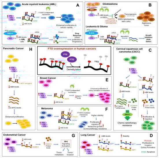 - Zhou, S.; Bai, Z.-L.; Xia, D.; Zhao, Z.-J.; Zhao, R.; Wang, Y.-Y.; Zhe, H. FTO regulates the chemo-radiotherapy resistance of cervical squamous cell carcinoma (CSCC) by targeting β-catenin through mRNA demethylation. Mol. Carcinog. 2018, 57, 590–597. [Google Scholar] [CrossRef] [PubMed]