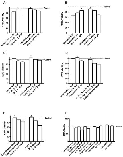 Cell viability of HepG2 cells incubated with the agents alone and combined, for 24 h. RYR = Red Yeast Rice. From A to E the dose-response study on cell viability was measured by MTT test of each single extract such as vitamin K2 and vitamin D3 (A), quercetin and resveratrol (B), CoQ10 and folic acid (C), astaxanthin and sodium selenite (D), sage extract and RYR (E). In (F) the effects of the better concentration of single agents alone and combined (Esterlo10®) were compared to RYR and atorvastatin alone. Viability was calculated as the reduction percentage of cells in the culture medium without the addition of test substances. Data are mean ± SD of five independent experiments performed in triplicates. * p < 0.05 vs. control.