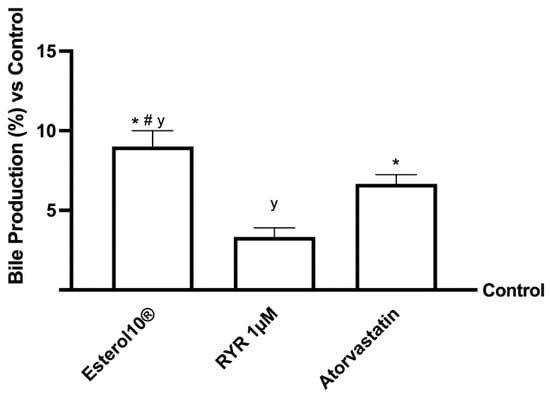 Bile acid production following treatment of hepatic in vitro model. The abbreviations are the same as reported in Figure 1. Data are mean ± SD of five independent experiments performed in triplicate. * p < 0.05 vs. control; # p <0.05 vs. RYR and y p < 0.05 vs. Atorvastatin.