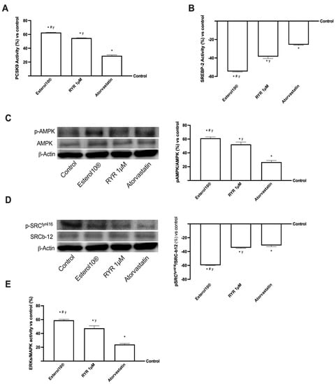 Intracellular pathways activated in HepG2 cells. In (A,B,E) the protein activity of PCSK9, SRC, and ERK was measured by an ELISA test; in (C,D) the analysis of AMPK and SRC performed by Western Blot and densitometric analysis. The abbreviations are the same reported in Figure 1. Data are mean ± SD of five independent experiments performed in triplicates. The images reported are an example of a Western blot obtained with technical replicates. * p < 0.05 vs. control; # p < 0.05 vs. RYR; y p < 0.05 vs. Atorvastatin.
