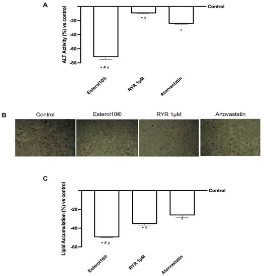 Some researchers have suggested that statin and monacolin K treatment is closely related to biochemical parameters responsible for liver injury. To explore this aspect, the tissue damage associated with our treatment was assessed by measuring alanine aminotransferase (ALT). According to the results shown in Figure 6 (panel A), ALT activity decreased significantly after treatment with Esterol10® compared to the control (p < 0.05) and compared to 1 µM RYR (about 7 times more) and to Atorvastatin (about 2 times more) confirming the positive role of Esterol10® in reducing liver damage; this is normally found after chronic treatment with statins, which as known leads to other risk factors, such as hypertension or diabetes mellitus. Furthermore, the effects of Esterol10® on the accumulation of HepG2 lipids were confirmed by determining the TG total content, both quantitatively and qualitatively, using the Oil Red stain and the lipid accumulation test, respectively, after 1 µM of Esterol10®, 1 µM RYR, and 1.25 µM of Atorvastatin for 24 h. As shown in Figure 6B, the total lipid accumulation determined by Oil Red staining was significantly higher (p < 0.05) in control cells than in other treatments; in particular, the attenuation of lipid accumulation was further contrasted by Esterol10® compared to Atorvastatin and, even more evidently, by 1 µM RYR. Furthermore, Esterol10® significantly reduced (p < 0.05) lipid levels compared to the control at 1 µM RYR and Atorvastatin (approximately 75%, 40%, and 88%, respectively). These results also demonstrate for the first time that Esterol10® regulates lipid metabolism without side effects.