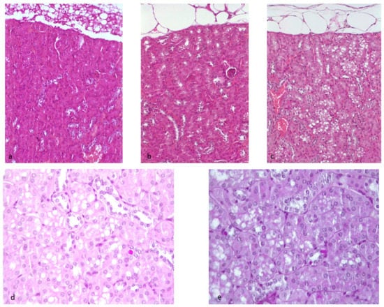 - Deji, N.; Kume, S.; Araki, S.; Soumura, M.; Sugimoto, T.; Isshiki, K.; Chin-Kanasaki, M.; Sakaguchi, M.; Koya, D.; Haneda, M.; et al. Structural and functional changes in the kidneys of high-fat diet-induced obese mice. Am. J. Physiol. Renal. Physiol. 2009, 296, F118–F126. [Google Scholar] [CrossRef]