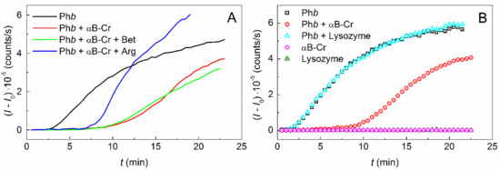 Analyzing the effect of Arg and αB-Cr on Phb aggregation at 48 °C, the following points should be noted. As it was shown in our previous work [36], the size of Phb start aggregates (Rh,0) at IS = 0.15 M remained unchanged, regardless of the Arg concentration. In the presence of 0.01 mg/mL αB-Cr and Arg, the Rh,0 sizes of Phb were found to be the same as in the absence of Arg (Table 2; 30.8 ± 2) and were equal to 31.9 ± 2 nm (data not shown). Thus, it can be concluded that αB-Cr reduces the size of Phb start aggregates during thermal aggregation at 48 °C. The addition of Bet leads to an increase in the Rh,0 sizes, while Arg does not affect the size of the start aggregates.