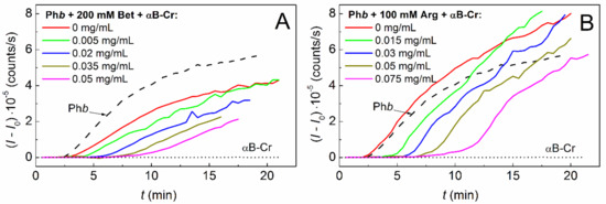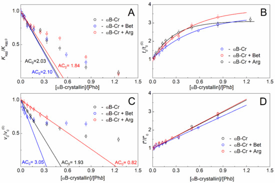 To assess the effect of chemical chaperones on the αB-Cr adsorption capacity to the model protein, kinetic curves of Phb aggregation were obtained in the presence of fixed concentrations of Bet (200 mM) or Arg (100 mM) and various concentrations of the heat shock protein (Figure 2A,B, respectively). The kinetic parameters of protein aggregation at the stage of nucleation (Kagg, t0) and the stage of aggregate growth (v0, t*) were calculated for each curve using Equations (1) and (2). The applicability of these equations for description of the kinetic curves of Phb aggregation in the absence and in the presence of additives is shown in Figure S1, Supplementary Materials.