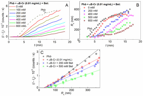 The calculation of the hydrodynamic radii (Rh) of the formed aggregates showed that an increase in the Bet concentration leads to a slowdown in the formation of large Phb aggregates in the presence of αB-Cr (Figure 4B). The initial point of the nucleation stage on the Rh curves on time at the moment t = t0, i.e., point with the coordinates {t0; Rh,0} corresponds to the sizes of start aggregates Rh,0 [37]. The Rh,0 values can be determined from the dependence of the light scattering intensity on the hydrodynamic radius (Figure 4C), as described in [38]. The data obtained indicate that, upon the interaction of Phb with αB-Cr (0.01 mg/mL) in the presence of Bet, the values of Rh,0 increase from 30.8 to 52.5 nm with increasing Bet concentration up to 600 mM (Figure 4C, Table 2).