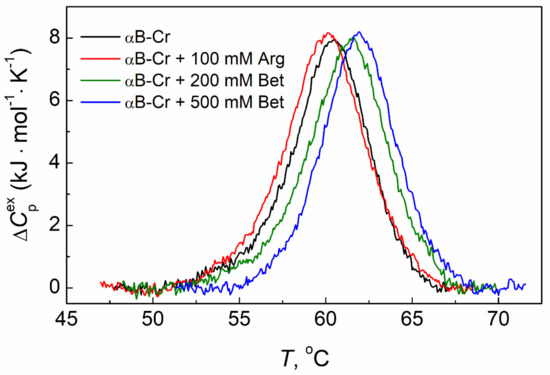 According to DSC data, Arg slightly destabilizes the tertiary structure of αB-Cr (1 mg/mL), shifting its DSC profile towards lower temperatures (Figure 5, black and red curves, respectively). The temperature of the thermal transition maximum (Tmax) for αB-Cr changes from 60.5 °C in the absence of additives to 60.1 °C in the presence of 100 mM Arg (Table 3). In contrast with Arg, the presence of 200 mM or 500 mM Bet shifts the DSC profiles of the protein towards higher temperatures up to Tmax = 61.6 or 62 °C, respectively (Figure 5, green and blue curves; Table 3). This indicates the αB-Cr stabilization under the action of Bet. It should be noted that the presence of these chemical chaperones has practically no effect on the calorimetric enthalpy of αB-Cr thermal transition (Table 3, ΔHcal). This means that the structural rearrangements in the protein molecule induced by Bet or Arg are insignificant.