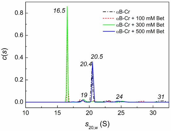 It is well known that the dynamic quaternary structure of αB-Cr is rearranged with a change in temperature and that this is a rather long process. Therefore, all samples and controls were studied simultaneously under the same conditions. Figure 6 shows the effect of Bet on the sedimentation behavior of αB-Cr at 48 °C. The c(s) distribution for αB-Cr exhibits one main peak with sedimentation coefficient (s20,w) 20.4 ± 0.3 S and several minor peaks with s20,w (18.6 ± 0.6 S; 22.8 ± 0.8 S; 31.2 ± 0.9 S). Comparison of the c(s) distributions in Figure 6 for αB-Cr in the absence of Bet (black line) with others shows that in the presence of 100 mM or 300 mM Bet, the main oligomeric form of αB-Cr (peak with s20,w = 20.4 ± 0.3 S) dissociates to form smaller ensembles (peak with s20,w = 16.5 ± 0.2 S). Under given conditions, the molecular mass of αB-Cr determined by the Svedberg equation (see Section 4.6) was equal to ~809 kDa (Table S1), and the molecular mass of αB-Cr in the presence of 300 mM Bet was equal to 486 kDa. Taking the molecular mass of αB-Cr monomer equal to 20 kDa, one can estimate that under these conditions major peak on c(s) distribution for αB-Cr (Figure 6) corresponds to 40-mer, while the major peak for αB-Cr in the presence of 300 mM Bet (Figure 6) corresponds to approximately 24-mer. When comparing the initial distribution for αB-Cr in the absence of Bet with the distribution in the presence of 500 mM Bet, the major peak of the distribution (20.5 S) almost coincides with the initial peak of αB-Cr (20.4 S). The results obtained indicate that low concentrations of Bet (up to 300 mM) stimulate dissociation of αB-Cr, while higher concentrations prevent this. The effect of higher Bet concentration (500 mM) on the oligomeric state of the αB-Cr at room temperature is given in Supplementary Materials (Figure S2). The all c(s) distribution is shifted slightly towards larger values of the sedimentation coefficient in the presence of 500 mM Bet. This indicates that the portion of larger oligomers in the c(s) distribution in the presence of 500 mM Bet increases (Figure S2). However, the weight-average sedimentation coefficients for both distributions are equal.