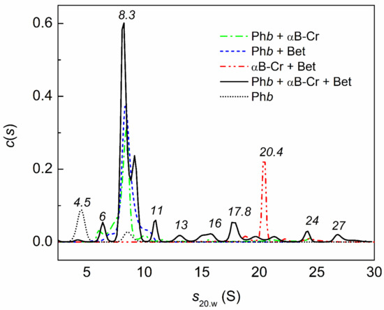 Figure 7 shows that under the studied conditions, Phb is represented by an unfolded monomeric form (peak with s20,w = 4.5 ± 0.4 S) and a partly unfolded dimeric form (8.5 ± 0.3 S, black dotted line). In the presence of 500 mM Bet, the c(s) distribution for Phb exhibits a broad peak (8.3 ± 0.8 S) with small shoulders at 10 ± 0.3 S and 6.7 ± 0.4 S (blue line). This means that 500 mM Bet can stabilize the native dimer of Phb (10 S), denatured dimer (8.3 S), and small oligomers. An analysis of the c(s) distributions in Figure 7 allows us to conclude that in the (Phb + αB-Cr) mixture (green line), the main (peak 8.3 ± 0.7 S) and minor (10 ± 0.4 S) forms are also stabilized. If we consider the c(s) distribution for a mixture of Phb (0.4 mg/mL) in the presence of αB-Cr (0.2 mg/mL) and 500 mM Bet (black solid line), we can see that the major peak of αB-Cr (with s20,w = 20.4 ± 0.3 S; red line) disappears and that the fraction of the main form with a peak of 8.3 S (black solid line) increases (the area under the curve increases), which means that 500 mM Bet enhances the interaction of αB-Cr with Phb under the studied conditions. In addition, many different in size Phb complexes with αB-Cr are presented (with s20,w 6.3 ± 0.4, 13 ± 0.5, 16 ± 0.7, 17.8 ± 0.6, 24 ± 0.5, 27 ± 0.5 S).