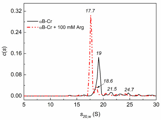 Figure 8 shows that the c(s) distribution for αB-Cr in the presence of 100 mM Arg is shifted toward smaller sedimentation coefficients. This suggests that the fraction of smaller oligomers increases in the presence of 100 mM Arg. Unfortunately, it was not possible to observe the effect of Arg on the interaction of αB-Cr with Phb at 48 °C, since the samples precipitated.