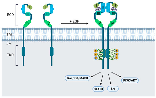 EGFR is a transmembrane protein comprised of an extracellular ligand-binding domain (ECD), a transmembrane domain (TD), a juxtamembrane (JM) segment, a tyrosine kinase domain (TKD), and a C-terminal regulatory tail [13,14]. The structure of EGFR with relevant domains is depicted in Figure 1. The ECD of EGFR is composed of four domains necessary for ligand binding. In an inactive state, domains I, II and III adopt a ‘closed’ conformation, while in an active state, EGF binds to the pocket between domains I and III and favors a conformational change to an ‘open’ untethered state [15]. This rearrangement allows domains II and IV to bind to the corresponding domains on the adjacent receptor leading to homo- or hetero-dimerization. The conformational change caused by ligand binding leads to auto- and trans-phosphorylation of the TKD with subsequent recruitment of adaptor proteins such as Src homology 2 (SH2) or phosphotyrosine-binding (PTB) domains. These domains then activate downstream pathways essential for cell survival and proliferation [15,16,17,18]. Since EGFR plays a critical role in regulating various cellular processes, oncogenic mutations in any of these domains result in aberrant expression and/or dysregulated signaling while also altering responses to EGFR targeting agents.