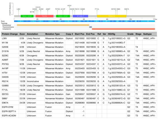EGFR mutations and gene fusions in HNSCC patients curated in the cBioPortal for Cancer Genomics in relation to EGFR exons and EGFR protein domains. The table shows details of the specific mutations and corresponding patients, including protein change, exon location, functional annotation according to OncoKB precision oncology knowledge base, type of mutation, EGFR gene copy number, mutation site, nucleotide change (reference [Ref] vs. variant [V]), Human Genome Variation Society genomic nomenclature (HGVSg), tumor grade, tumor, stage, HPV subtype (+, positive; −, negative). EGFR mutational and clinical data were visualized, analyzed, and downloaded from the cBioPortal for Cancer Genomics (https://www.cbioportal.org; accessed on 19 March 2022 [22,23]).