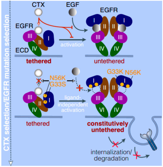 - Orellana, L.; Thorne, A.H.; Lema, R.; Gustavsson, J.; Parisian, A.D.; Hospital, A.; Cordeiro, T.N.; Bernado, P.; Scott, A.M.; Brun-Heath, I.; et al. Oncogenic mutations at the EGFR ectodomain structurally converge to remove a steric hindrance on a kinase-coupled cryptic epitope. Proc. Natl. Acad. Sci. USA 2019, 116, 10009–10018. [Google Scholar] [CrossRef]