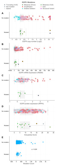 EGFR mutations in relation to EGFR copy number (A), mRNA (B), protein (C), and genome-wide aneuploidy (D) levels and overall mutational burden (E) in HNSCC patients curated in the cBioPortal for Cancer Genomics. EGFR mutations rarely co-segregate with EGFR amplifications (A) and show ranges of EGFR mRNA (B) and protein (C) expression comparable to their non-amplified counterparts. EGFR mutated tumors show a range of chromosomal aneuploidy scores (D) similar to non-mutated tumors, but demonstrate a significantly lower overall mutational burden (E). EGFR genomic, and aneuploidy, and mutational count data were visualized, analyzed, and downloaded from the cBioPortal for Cancer Genomics (https://www.cbioportal.org; accessed on 19 March 2022 [22,23]).