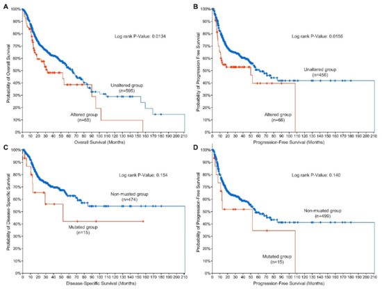 EGFR alterations and survival in H&N cancer patients curated in the cBioPortal for Cancer Genomics. Patients who carry EGFR mutations and/or amplifications demonstrate a significantly briefer overall (A) and progression-free survival (B) than patients with unaltered EGFR. EGFR mutations are suggestively associated with disease-specific (C) and progression-free survival (D). EGFR genomic and clinical data were visualized, analyzed, and downloaded from the cBioPortal for Cancer Genomics (https://www.cbioportal.org; accessed on 19 March 2022 [22,23]).