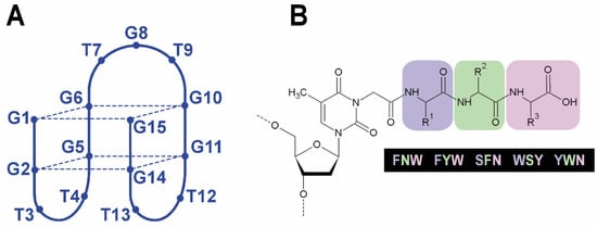 Anti-parallel G-quadruplex formed by TBA (A) and peptide subunit of TBA OPCs (B). The tripeptide side chain is attached to the thymine base through an N3-carboxymethyl linker that mimics glycine and may be regarded as the fourth invariable amino acid.