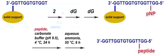 Although the current approach was developed specifically for the synthesis of T3-modified TBA, it may be easily adapted for the preparation of a wide variety of OPCs, preferably with a peptide unit arranged in the proximity of the 5′ end of the oligonucleotide. The presence of a single unprotected amino group in the peptide sequence is required to implement the described method for the regioselective preparation of OPCs.