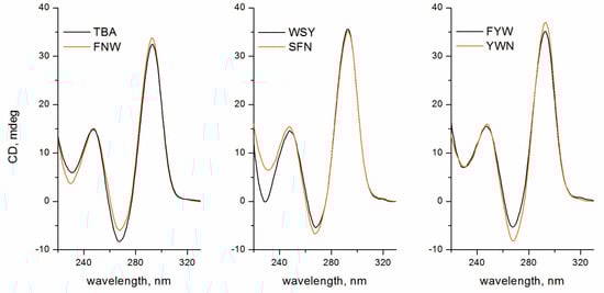 Since the presence of a peptide unit may potentially affect the folding and stability of the TBA G-quadruplex architecture, we studied TBA OPCs in this respect. Folding of TBA OPCs was inspected by circular dichroism (CD) spectroscopy in 100 mM KCl buffer (Figure 3). The typical pattern of a two-layer antiparallel G-quadruplex featuring a negative band at 268 nm and two positive bands at 248 and 293 nm was reproduced for all studied TBA OPCs. Further study of the thermal stability of folded structures by UV spectroscopy in 100 mM KCl buffer showed that adding a peptide unit to the T3 residue of TBA induced minor to moderate stabilization compared to the parent structure (Table 1 and Figure S1). The Tm values for TBA OPCs fell within the range of 54.2–57.9 °C. (Table 1). The most notable stabilization effect (+5.4 °C) was detected for TBA–FYW. These findings suggest that the peptide side chain at T3 did not interfere with the TBA architecture. Moreover, depending on the amino acid sequence, the peptide subunit can induce notable stabilization, which should be associated with specific intramolecular interactions.