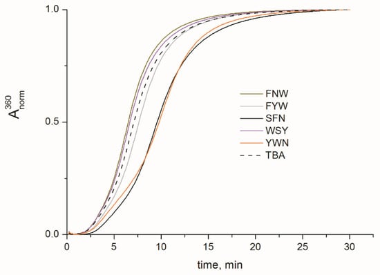Normalized fibrinogen clotting curves in PBS at 25 °C in the presence of TBA OPCs. TBA–YWN and TBA–SFN demonstrate notably improved anticoagulant activity.