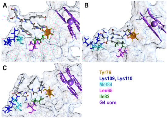 In the most potent thrombin inhibitor, TBA–YWN, Tyr17 stacked with the T3 base most of the time (Figure 5A). This was clearly observed from the dynamics of the angle and distance between the two residues (Figure S4). The Tyr17 aromatic ring was able to flip occasionally, as confirmed by a quick change in the angle between normals from 20–40° to 130–160°. Periodically, the T3 pyrimidine base insignificantly weakened its contacts with Tyr76 (Figure S4), but overall, the stacking system Tyr17–Thy3–Tyr76 was highly stable. The most notable contribution to the additional interactions of TBA–YWN with thrombin should be attributed to Trp18, which is allocated in close proximity to the residues Met84, Leu65, and Ile82. The distance between these amino acids and Trp18 is predominantly within the range of 4–6 Å. The cumulative value of van der Waals and electrostatic interactions was highest for the pair Trp18–Met82, thus pointing to the major role of Met82 in the direct contact with the YWN subunit (Figure S4). The terminal residue Asn19 turned outward from the complex and did not form stable contacts with the protein. Despite this fact, Asn19 may play an important role as a steric barrier between thrombin and fibrinogen. Indeed, this configuration is preserved by highly stable arrangements of Tyr17 and Trp18.