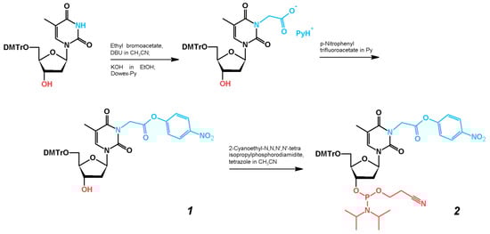 The preparation of thymidine phosphoramidite derivative 2 with activated carboxylic acid residue at the N3 position of the pyrimidine heterocycle is outlined in Scheme 1. The synthesis of 5′-O-(4,4′-dimethoxytrityl)-N3-carboxymethylthymidine was carried out as described previously by selective N-alkylation of the partially protected thymidine with ethyl bromoacetate in the presence of DBU, followed by alkaline hydrolysis [,]. Further activation of the carboxyl group smoothly proceeded upon treatment with an excess of pNP-TFA ester in pyridine []. The target phosphoramidite 2 was prepared by a standard reaction of an activated thymidine derivative with 2-cyanoethyl N,N,N′,N′-tetraisopropylphosphorodiamidite in the presence of tetrazole. Importantly, both pNP-activated nucleoside 1 and phosphoramidite 2 could be purified by column chromatography in the presence of 0.3% pyridine without notable damage to the pNP and phosphoramidite functionalities.
