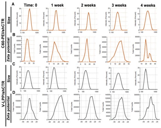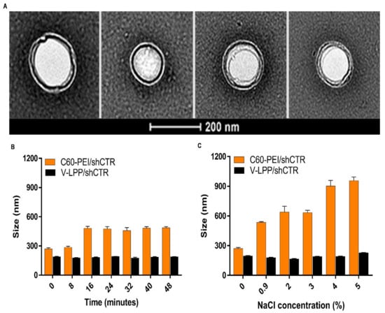 The physical stability of LPP was determined by measuring their dimensions and ζ-potentials at fixed time intervals (1, 2, 3, and 4 weeks), and compared to the initially measured values. The colloidal stability of LPP in phosphate buffer saline (PBS) was assessed by the DLS method over 48 min, each record being made at an interval of 8 min. Moreover, to study the effect of electrolytes on the LPP stability, the LPP/shCTR lipopolyplexes were incubated with different concentrations of sodium chloride (0.9 ÷ 5% w/v) for 1 h at 37 °C followed by particle size determinations. For comparison, the colloidal stability and electrolyte-induced flocculation of C60-PEI/shCTR polyplexes, as the core of the LPP were determined.